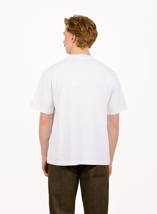 Olaf Hussein Script Friends Boxy Tee Optical White – playful detail, modern silhouette